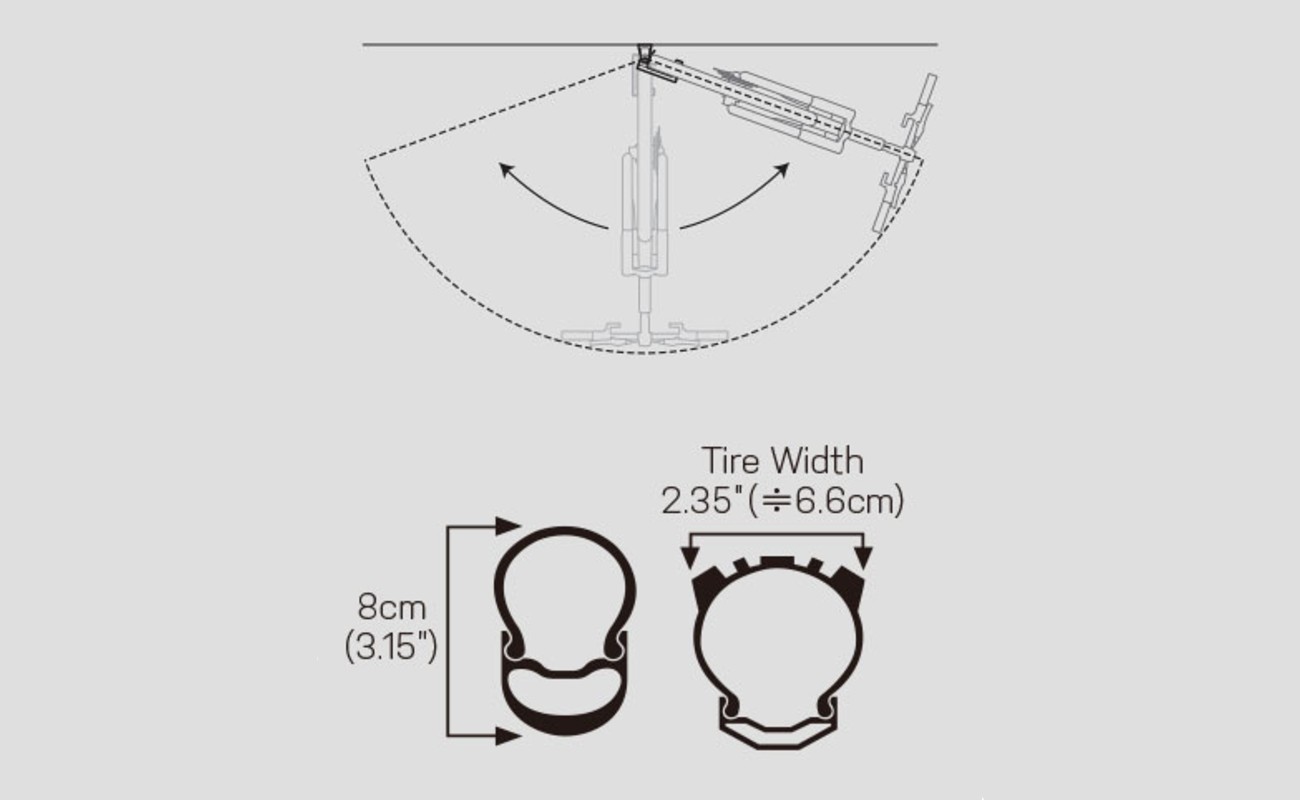 Kompaktno i ekonomično rješenje za pohranu bicikla i optimizaciju korištenja prostora. Swing-Up EX omogućuje vam okretanje bicikla u bilo koju stranu i kompatibilan je s kombinacijama kotača / guma ukupne visine od 8 cm i širine gume do 2,35″ (približno 6,6 cm).